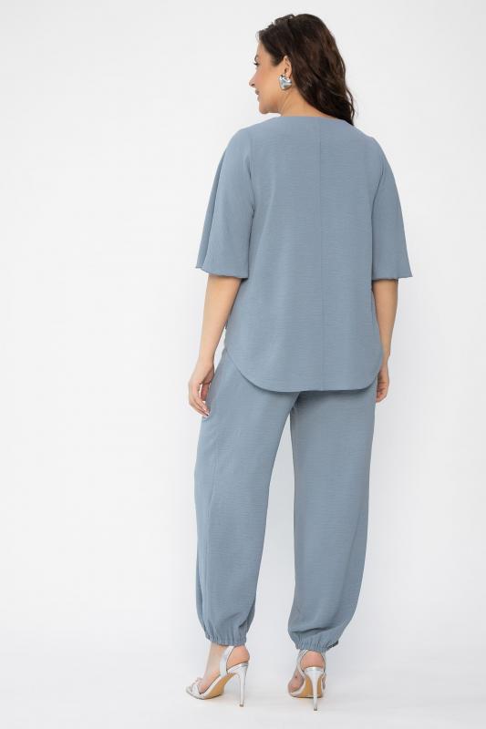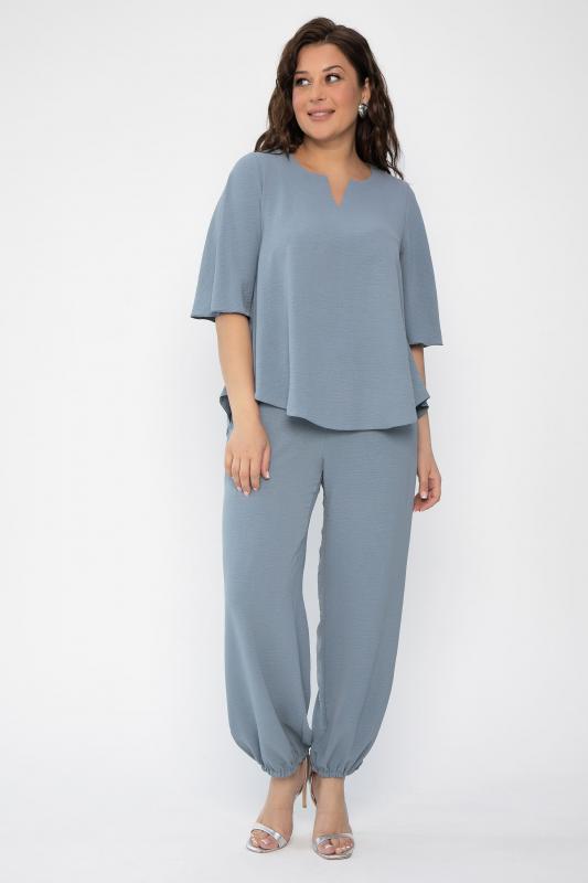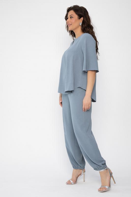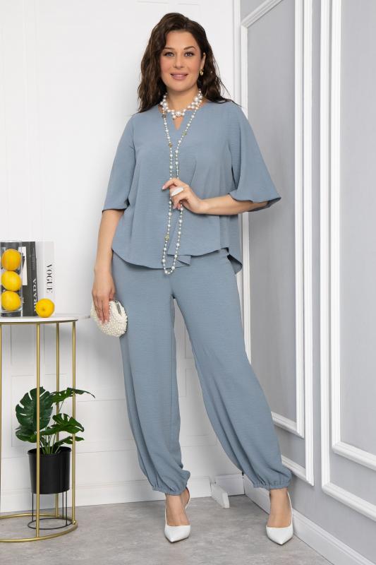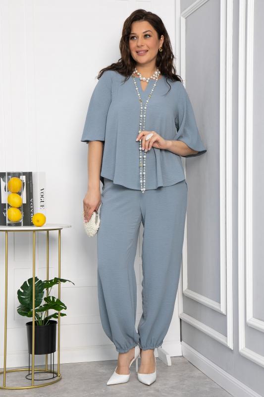 Легкий, приятный к телу брючный костюм в серо-голубом оттенке, преимущественно из хлопка, покорит вас с первого прикосновения. Блуза свободного кроя с воздушными фалдами имеет рукав средней длины и V-образный вырез. Свободные брюки в стиле палаццо придают костюму легкость и особый шик. Брюки имеют пояс на комфортной резинке, что позволяет чувствовать себя свободно и не сомневаться при выборе размера. Низ брюк деликатно собран резинкой, которую по желанию можно растянуть-стянуть по размеру своей ножки или вовсе убрать, и тогда у вас получатся прямые к низу брюки. Свободный силуэт костюма подходит абсолютно для любой фигуры. Костюм актуален для любого мероприятия, романтических встреч и летних прогулок..