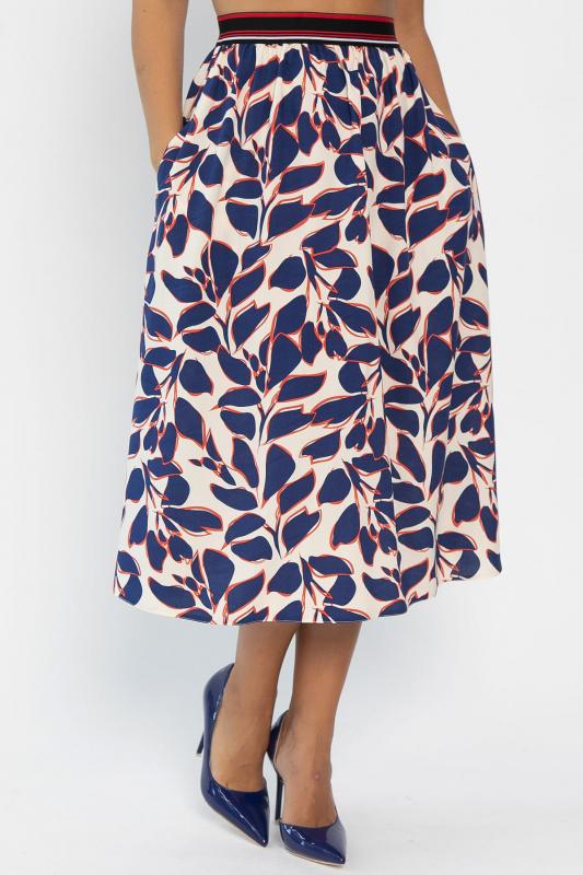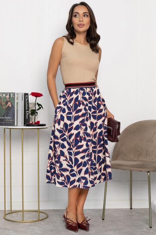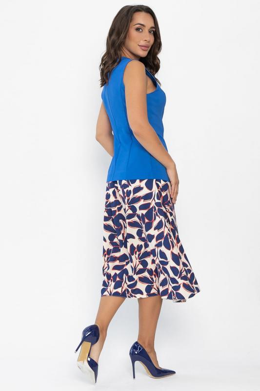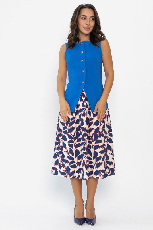 Отснято с брюками Б12685-13 и с топом Б13054-33М Данный костюм представляет собой оригинальное сочетание женственного и функционального стиля. Составляющие костюма включают: 1. Приталенная модель жилета с классической застежкой на пуговицах, подчеркивающая фигуру. Отсутствие карманов делает внешний вид лаконичнее. 2. Юбка выполнена из штапельного материала с красивым принтом в виде листьев синего цвета с красными контурами. Расширяется книзу, что обеспечивает свободу движений и создает плавные линии силуэта. Имеет удобные боковые карманы. Наслаждайтесь элегантностью и красотой, надев этот костюм!