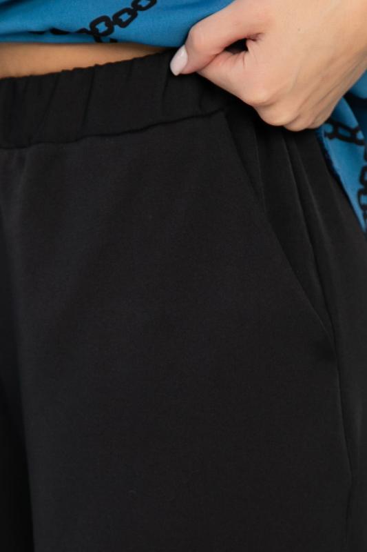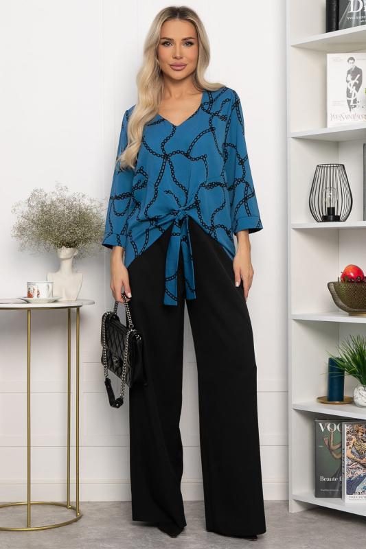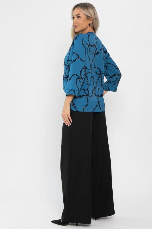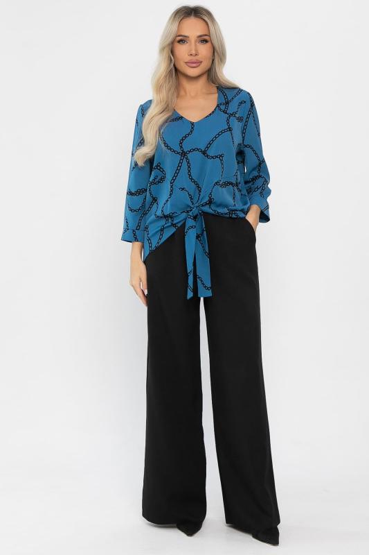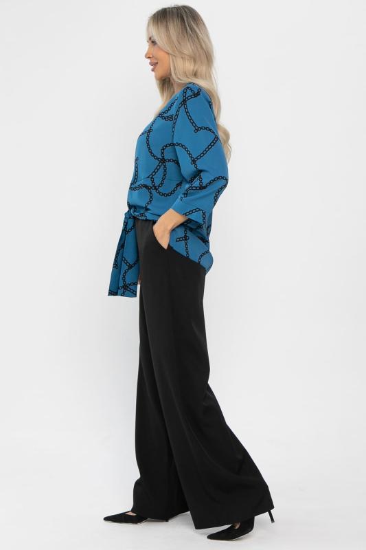 Стильный брючный костюм — это идеальное сочетание элегантности, удобства и функциональности для повседневных и деловых ситуаций. Блузка синего цвета с оригинальным принтом добавляет яркости образу и подчеркивает вашу индивидуальность. Однотонные черные брюки с резинкой по талии и карманами по бокам создают завершенный и стильный вид. Этот комплект поможет вам чувствовать себя уверенно и комфортно в любой день.