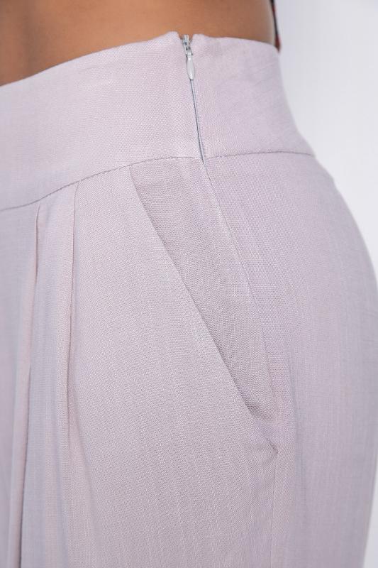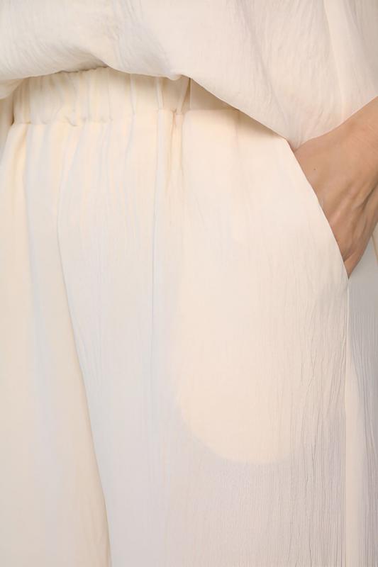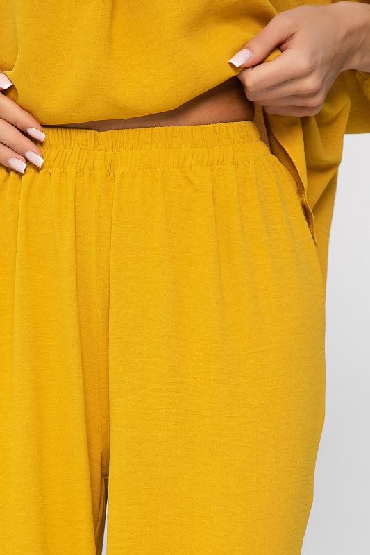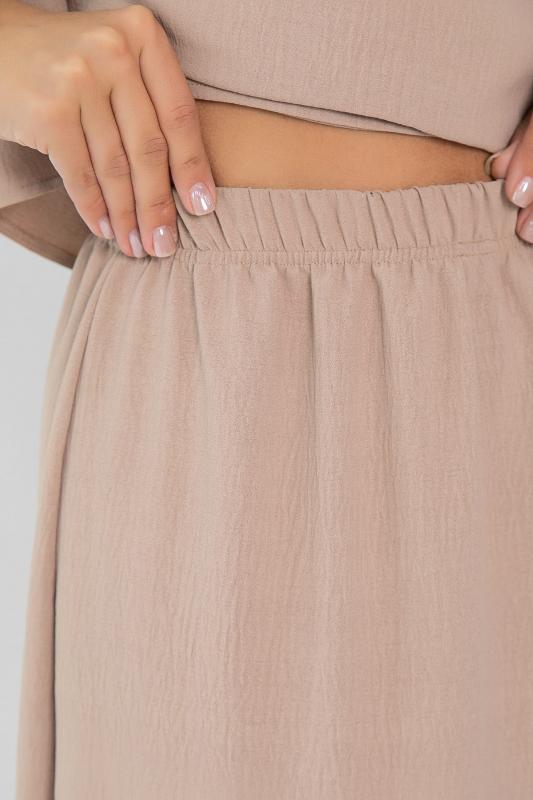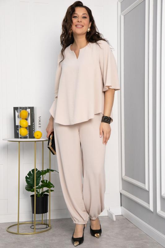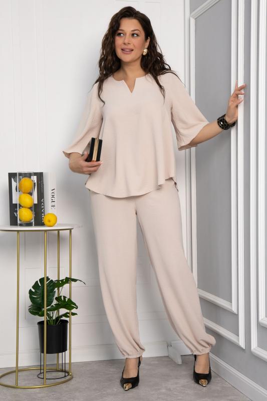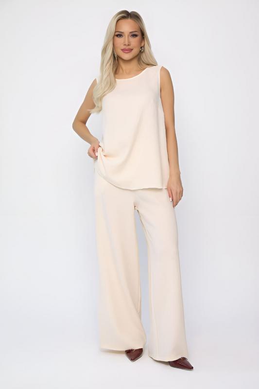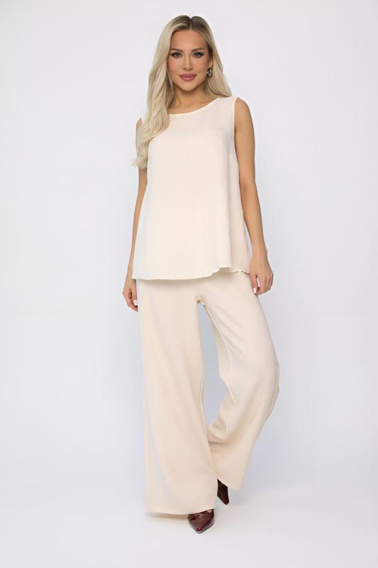 Костюм свободного кроя в нежном оттенке крем-брюле состоит из легкого топа и просторных брюк-палаццо. Высокая посадка с резинкой в поясе обеспечивает комфорт и удобство. Карманы в боковых швах добавляют практичности и стильности образу. Идеальный вариант для летнего отдыха и повседневных прогулок.