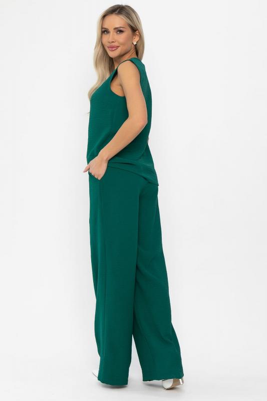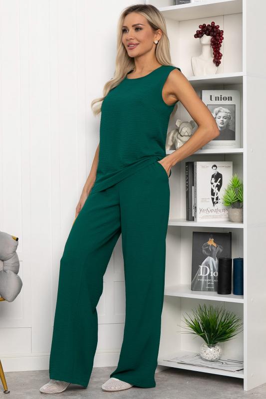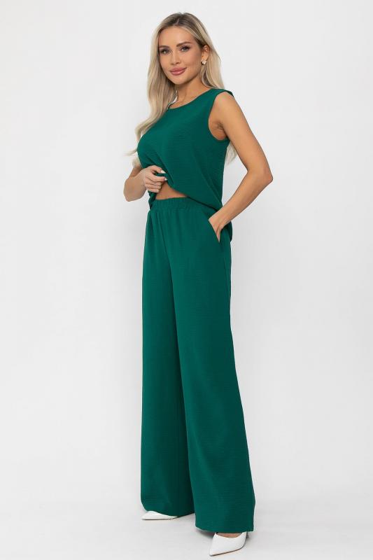 Женский костюм-двойка в тёмно-зелёном цвете — это то, что нужно для тех, кто ищет баланс между удобством и элегантностью. Костюм состоит из двух частей: 1. Верхняя часть — свободная майка с изящным вырезом и без рукавов. Лёгкая ткань позволяет коже дышать, обеспечивая ощущение свежести и комфорта. 2. Нижняя часть — широкие брюки-палаццо, которые создают эффект струящегося движения и подчёркивают стройность фигуры. Два удобных боковых кармана и талия на резинке. Благодаря свободной посадке костюм не сковывает движений и позволяет чувствовать себя уверенно в течение всего дня. Такой наряд будет уместен как в городе, так и на отдыхе.