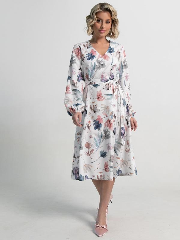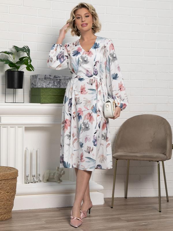 Струящееся платье, идеально подчёркивающее вашу женственность. Платье А-силуэта с красивым V-образным вырезом горловины красиво очертит зону декольте. Красивый пышный рукав на резинке. Пояс из основной ткани входит в комплект.