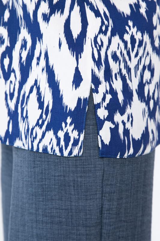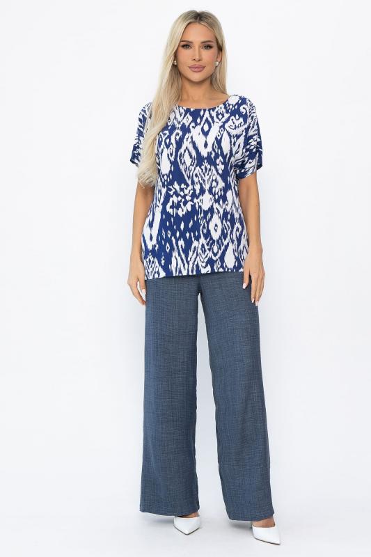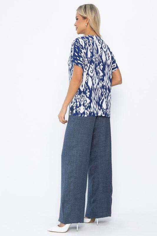 Артикул: К13143-25М. Тип ткани: натуральный. Состав: 50% хлопок, 50% вискоза. Материал: штапель. Цвет: синий. Принт: у верха цветочный принт, брюки однотонные. Вид застежки: без застёжки. Карманы: отсутствуют. Резинка в поясе: есть. Силуэт: прямой. Декоративные элементы: отсутствуют. Длина верха по спинке от верхней точки плеча: 44- 65 см, 46- 66 см, 48-50- 67 см. Длина брюк по боковому шву: 44-48- 103 см, 50- 104 см. Размер изделия на модели: 44 Рост модели: 168 см.