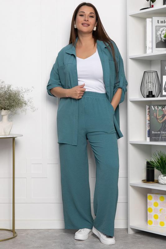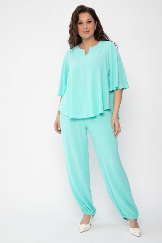 Артикул: К10412. Ткань: сингапур - плотная шелковистая ткань с жатой фактурой. Состав: 83% п-э, 12% вискоза, 5% эластан. Цвет: морская волна. Вид застежки: отсутствует. Силуэт: свободный. Карманы: есть. Длина изделия блуза по спинке: 46-54- 63 см. Длина брюк с учётом резинки: 46-54- 109 см. Рост модели: 170 см. Костюм из лёгкой ткани отлично походит как для повседневной жизни, так и для праздничного мероприятия. Для более праздничного образа можно добавить украшения. На брюках есть вшитый пояс, благодаря которому можно регулировать ширину талии. Блуза с коротким и цельнокроеным рукавом. Уход за изделием: бережная стирка до 30 градусов