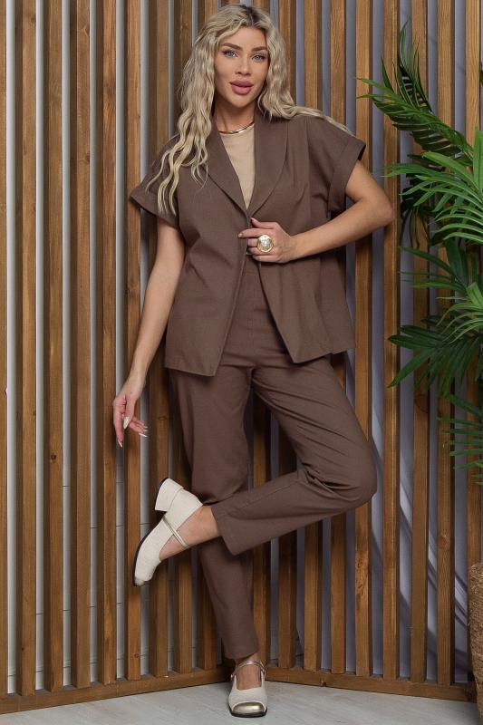 Состав: 100% хлопок. Материал: хлопок. Цвет: кофейный. Принт: отсутствует. Силуэт: полуприлегающий. Карманы: есть. Резинка в поясе: есть. Вид застежки: без застёжки. Декоративные элементы: пояс из основной ткани на двух полукольцах в комплекте. Длина верха: 46- 67 см, 48- 68 см, 50- 69 см, 52- 70 см, 54- 71 см, 56- 72 см. Длина брюк: 46-56- 103 см. Костюм отснят с топом арт.Б13054-33М Летний женский брючный костюм из натуральных тканей — это идеальный выбор для повседневного ношения в жаркие дни! Брюки классического кроя с резинкой по талии и карманами по боковым швам обеспечат вам удобство и комфорт. Верх костюма с шалевым воротником и цельнокроеными рукавами на манжетах придадут вашему образу элегантность и утонченность. А пояс из основной ткани на двух полукольцах завершит стильный образ. Этот костюм станет вашим незаменимым спутником в летние дни, позволяя вам чувствовать себя уверенно и комфортно. Ткань имеет растяжение. Уход за изделием: ручная стирка до 30 градусов