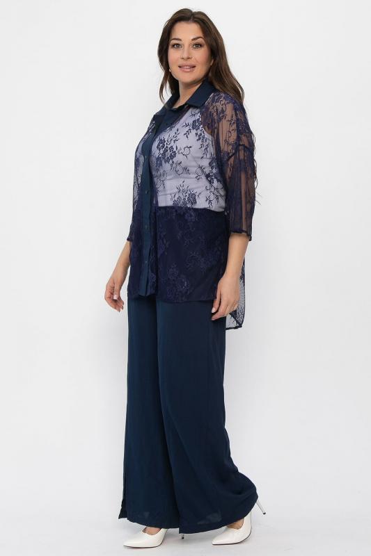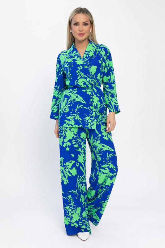 Артикул: К10568. Тип ткани: смесовая. Состав: 50% хлопок, 50% вискоза. Материал: штапель. Цвет: синий. Принт: цветы. Вид застежки: отсутствует. Силуэт: свободный. Карманы: есть. Декоративные элементы: отсутствуют. Длина верха по спинке: 44-48- 67 см, 50-54- 68 см. Длина брюк с учетом резинки: 44-48- 107 см, 50-54- 109 см. Размер изделия на модели: 44. Рост модели: 168 см. Костюм из лёгкой ткани идеально подойдёт для летнего расслабленного образа. Свободный крой не сковывает движений и дарит комфорт. Рукав три четверти, со спущенным плечевым швом. В комплект входит пояс из основной ткани, который позволит подчеркнуть преимущества фигуры. Уход за изделием: ручная стирка до 30 градусов