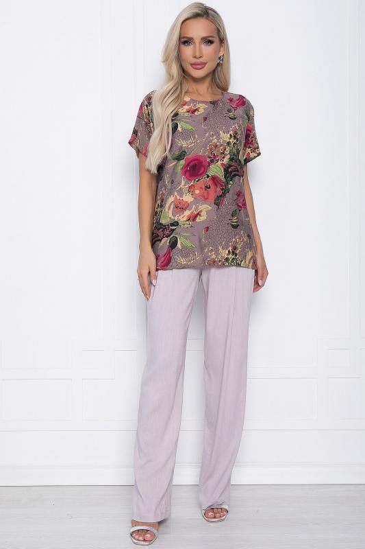 Артикул: К10855. Тип ткани: смесовая. Состав: у брюк - 65% п-э, 30% вискоза, 5% эластан, у блузки - 100% вискоза. Материал: штапель, костюмная. Цвет: мультиколор, пудра. Принт: цветы. Вид застежки: молния, пуговица. Карманы: есть. Резинка в поясе: отсутствует. Силуэт: свободный. Декоративные элементы: отсутствуют. Длина верха: 46- 65 см, 48- 66 см, 50-52- 68 см, 54-56- 69 см. Длина брюк: 46-52- 105 см, 54-56- 107 см. Размер изделия на модели: 44. Рост модели: 168 см. Невероятный брючный костюм со свободным кроем! Комбинируется с различными аксессуарами и другими элементами гардероба для создания разнообразных образов. Он обеспечивает максимальный комфорт и удобство, что особенно важно. Красивый цветочный принт у блузки прекрасно гармонирует с однотонными брюками. Блузка прямого силуэта со спущенным рукавом, застёгивается на пуговицу, по бокам разрезы, выполнена из штапеля. В боковых швах у брюк расположены карманы, сбоку молния, выполнены из костюмной ткани. Уход за изделием: ручная стирка до 30 градусов
