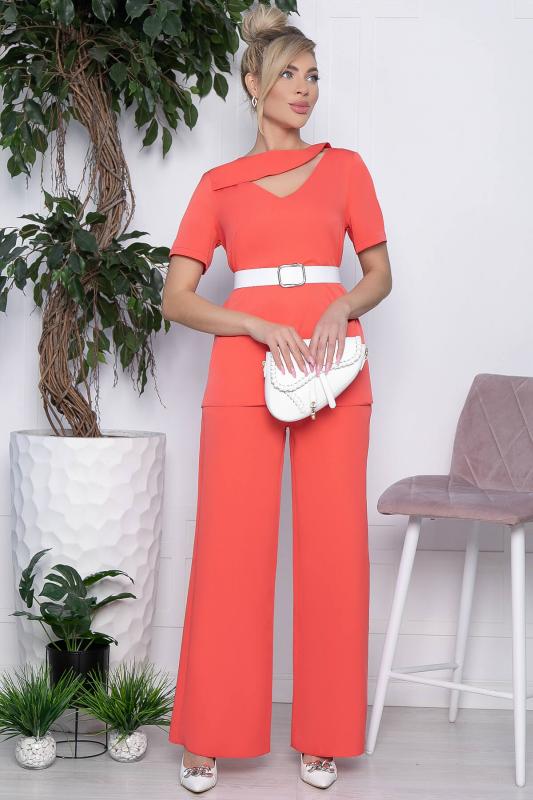 Артикул: К10716. Тип ткани: смесовая. Состав: 65% п-э, 30% вискоза, 5% эластан. Материал: лайт. Цвет: коралловый. Принт: отсутствует. Вид застежки: пуговица. Карманы: есть. Декоративные элементы: отсутствуют. Длина верха: 46- 67 см, 48- 68 см, 50- 69 см, 52- 70 см, 54- 71 см. Длина брюк: 46- 101 см, 48-50- 106 см, 52-54- 107 см. Размер изделия на модели: 44. Рост модели: 170 см. Яркий костюм украсит ваши образы для праздничных мероприятий! В комплект входит белый ремень, который подчеркнёт талию. Сзади у блузки пуговица, по бокам разрезы. Карманы у брюк расположены сбоку, талия на резинке. Уход за изделием: ручная стирка до 30 градусов