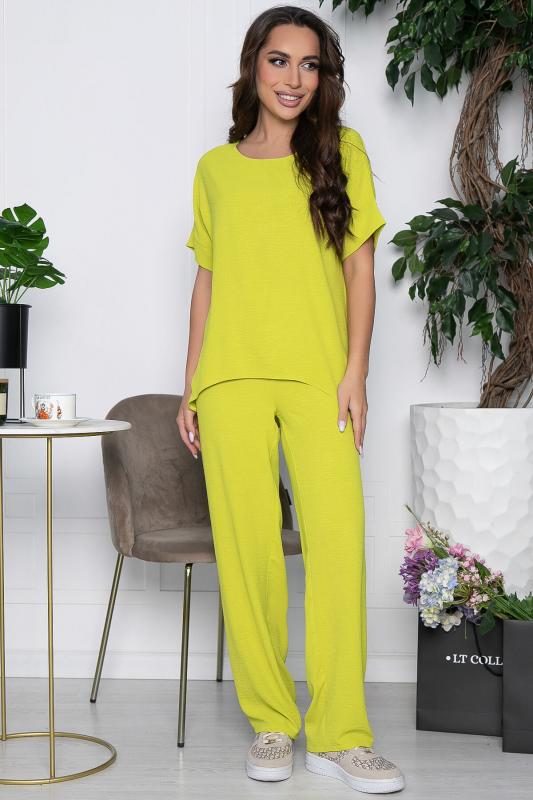 Артикул: К10189. Ткань: Сингапур - плотная шелковистая ткань с жатой фактурой. Состав: 83% п-э, 12% вискоза, 5% эластан. Цвет: лаймово-зелёный. Вид застежки: отсутствует. Силуэт: свободный. Карманы: есть. Длина изделия блуза по спинке: 46-54- 63 см. Длина брюк с учётом резинки: 46-54- 109 см. Рост модели: 168 см. Костюм из лёгкой ткани отлично походит как для повседневной жизни, так и для праздничного мероприятия. Для более праздничного образа можно добавить украшения. На брюках есть вшитый пояс, благодаря которому можно регулировать ширину талии. Блуза с коротким и цельнокроеным рукавом. Уход за изделием: бережная стирка до 30 градусов