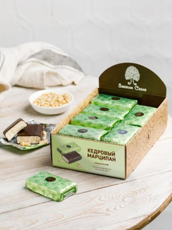Блок классического кедрового марципана в фирменной блок-коробке кондитерской фабрики «Сибирский кедр» станет украшением витрины лавки сладостей, уютной кофейни. В блоке 18 брусочка марципана, приготовленного из измельченных ядер кедровых орешков, кешью, цельного сгущенного молока и других натуральных ингредиентов.