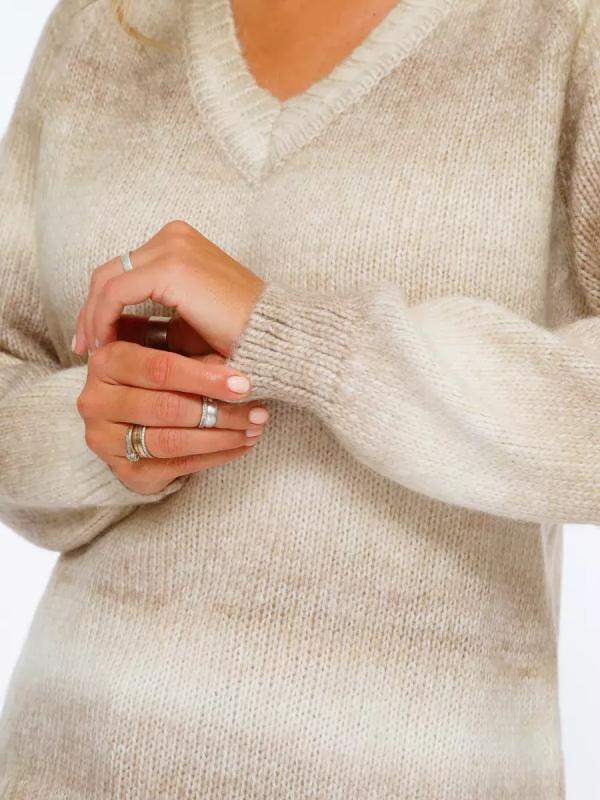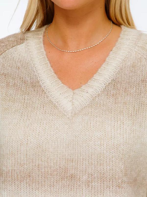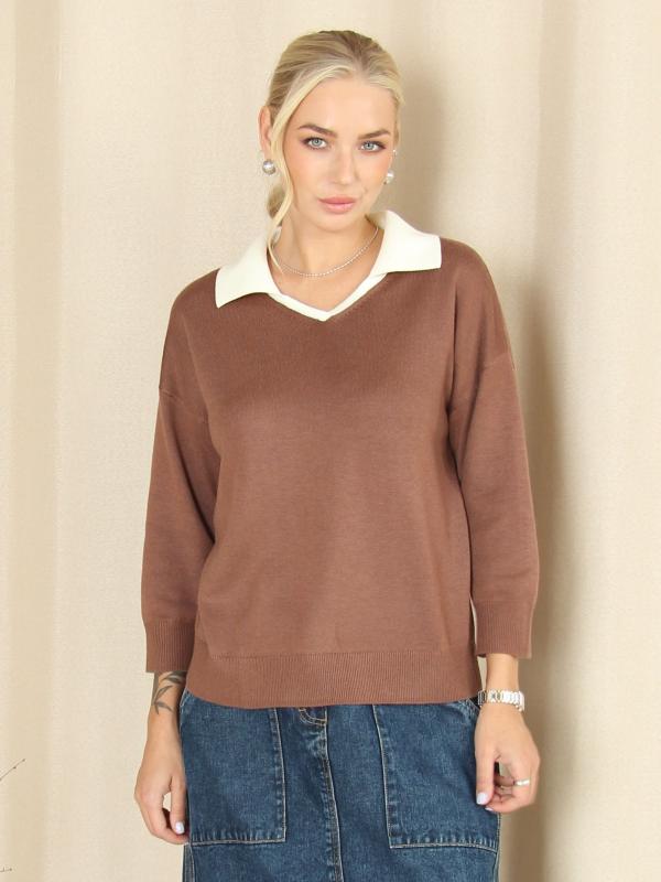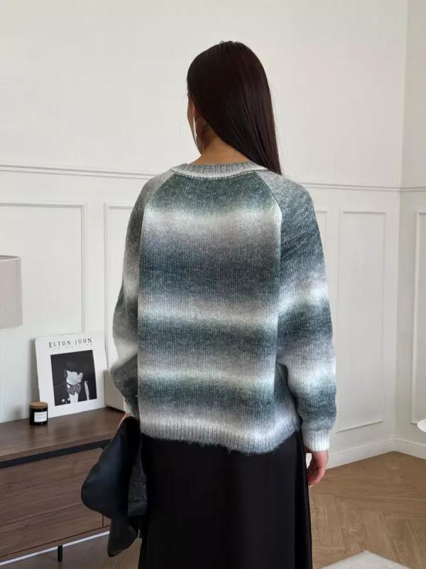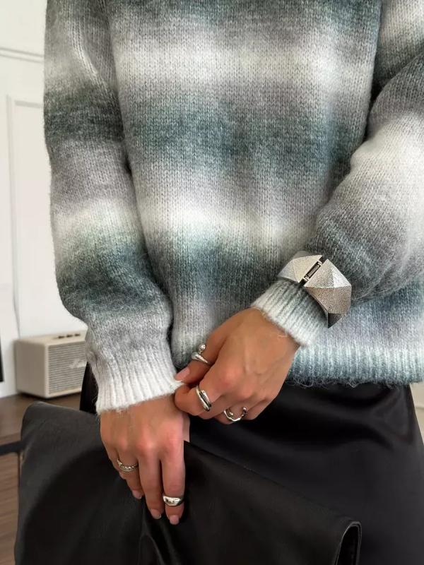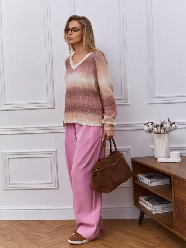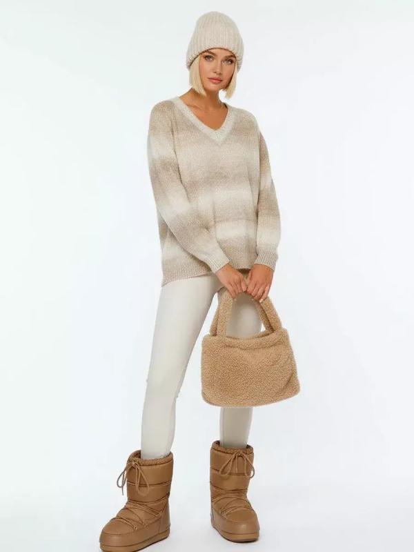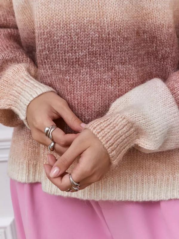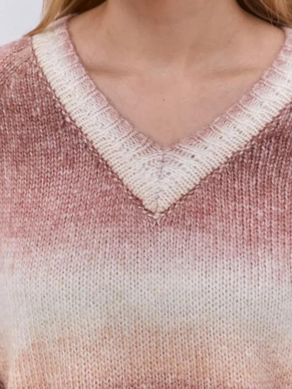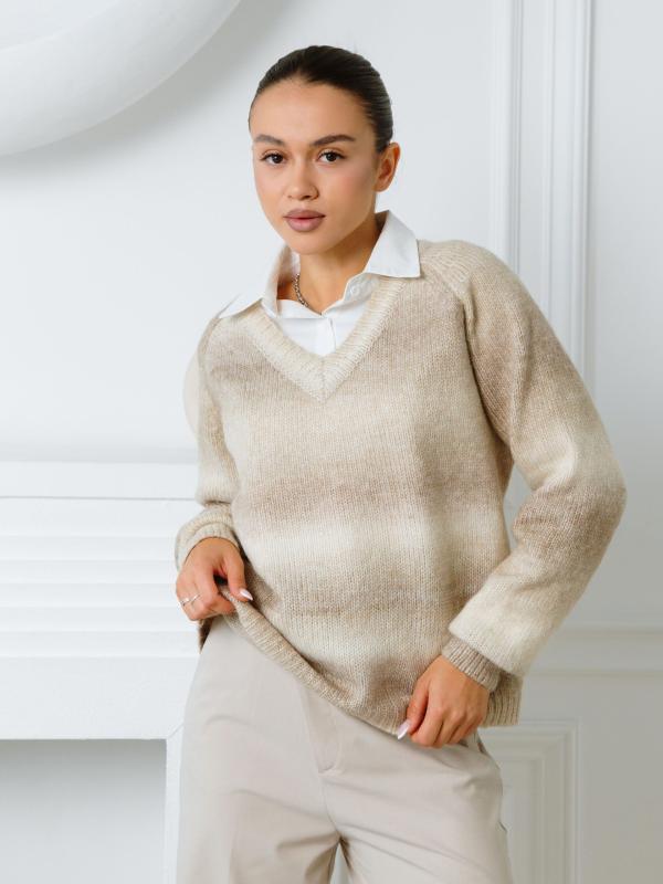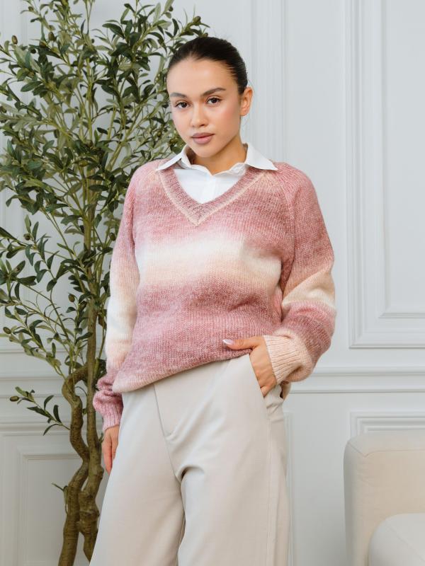 Джемпер свободного силуэта с объёмными рукавами-реглан и фактурной вязкой. V-образный вырез подчёркивает линию шеи и добавляет образу лёгкости. Эластичная отделка по краям создаёт аккуратный силуэт. Идеален для многослойных сочетаний — с брюками, юбками и поверх рубашек.