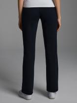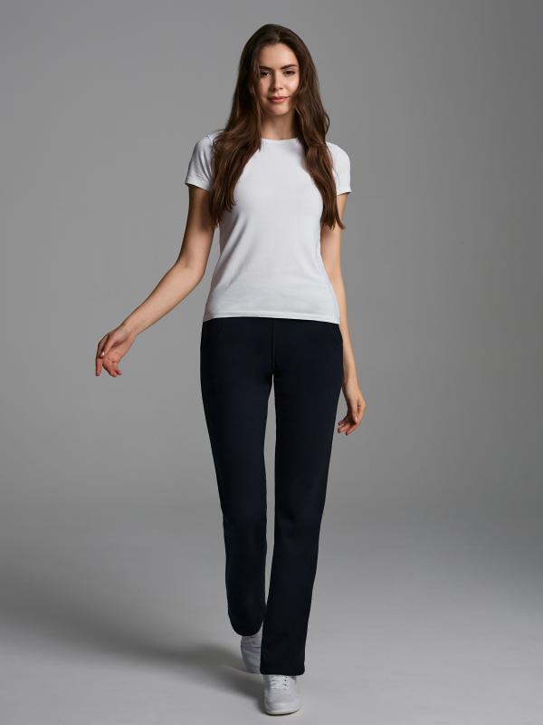 Брюки женские из плотного и мягкого хлопкового трикотажного полотна с изнаночным начесом. Пояс брюк и листочки на боковых карманах из эластичного трикотажного полотна рибана. Пояс по линии талии регулируется шнуром на лицевую сторону через люверсы. Крой брюк прямой.