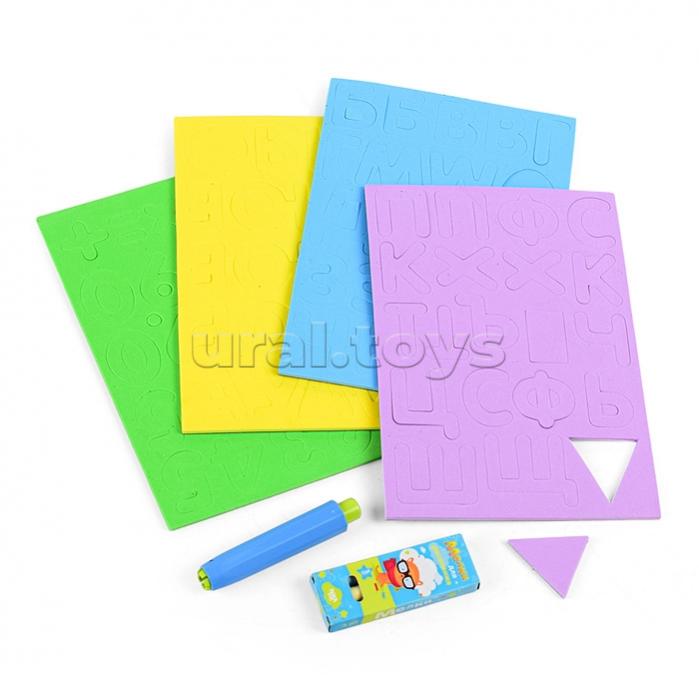 В комплект входят: мелки ( 8,5 см), алфавит, цифры, знаки.