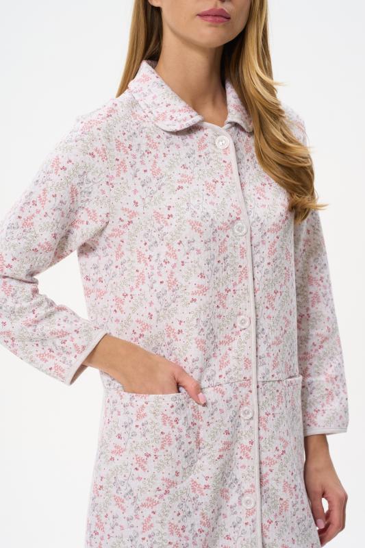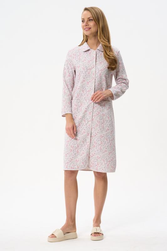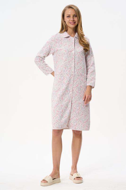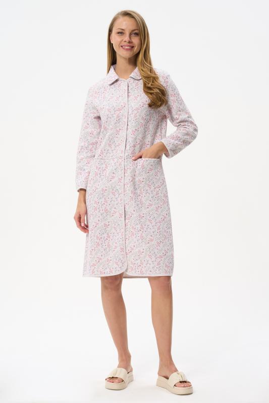 Халат из хлопкового полотна - капитоний. Отложной воротник, центральная застежка на пуговицы, в подрезах полочки - карманы. Длинные втачные рукава. Длина изделия чуть ниже колена. Рост модели на фото 178 см.