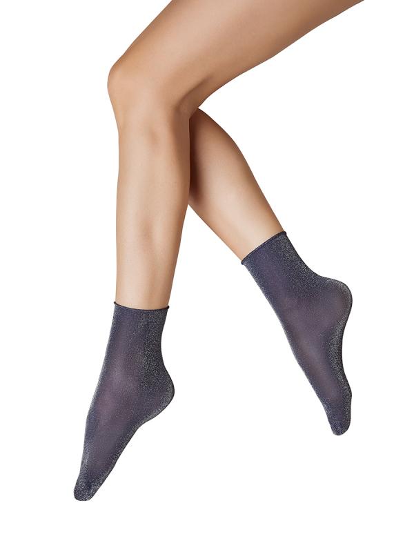 Женские эластичные носки с эффектом тюля и люрексом. Благодаря особенностям плетения, носочки более устойчивы к появлению затяжек, превосходно облегают, и обладают легким мерцающим эффектом.