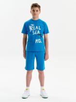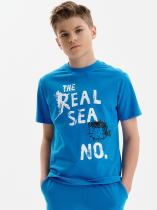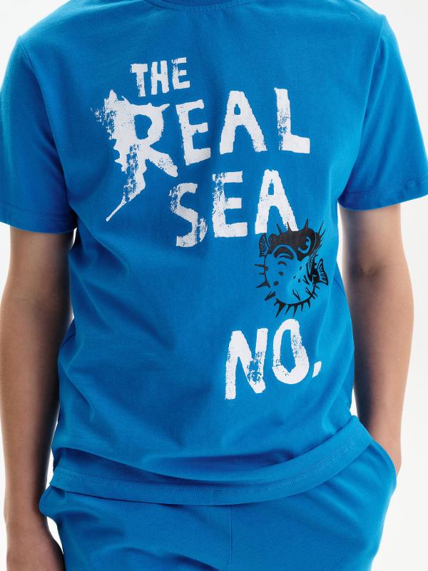 Футболка для мальчика маленького объема. Вырез горловины обработан эластичной рибаной — она прекрасно держит форму, не растягивается, при этом ребёнку удобно надевать и снимать футболку. Футболка с принтом и надписями. Перевод: настоящее море: нет: да.